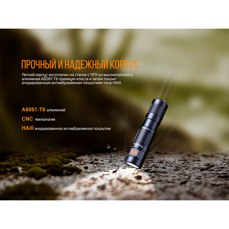 Корпус ліхтаря зробили з міцного і надійного алюмінію A6061-T6. Поверхня оброблена преміальним жорстким анодуванням, стійким до абразивів. Стандарт захисту від пилу і води: IP68. Модель легко переносить падіння з висоти до одного метра. Розміри складають 79*19,3*18,4 вага дорівнює 45 грамам.