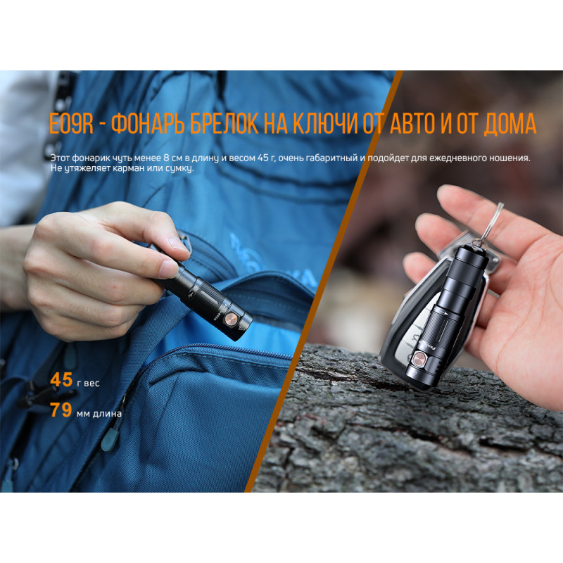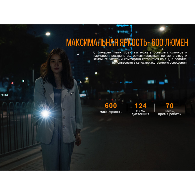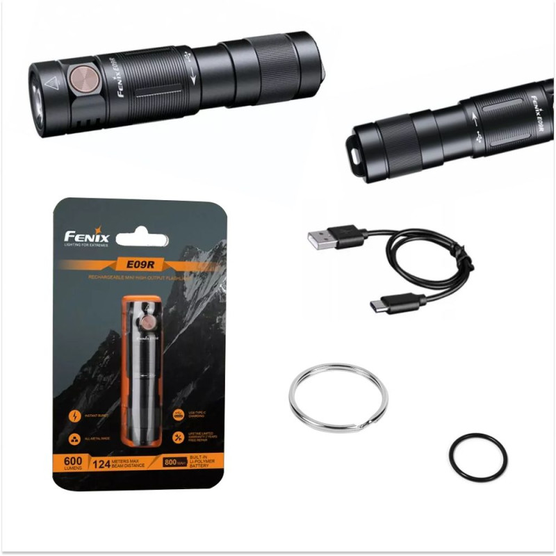 Модель Fenix E09R являє собою невеликий і легкий брелок, який дає освітлення максимальною яскравістю до 600 люменів. При цьому далекобійність променя досягає 124 метрів. Функціонує ліхтар на світлодіоді Luminus SST20, а елементом живлення служить вбудований Li-Po акумулятор 800 маг. Термін служби такого діода досягає 50 тисяч годин.