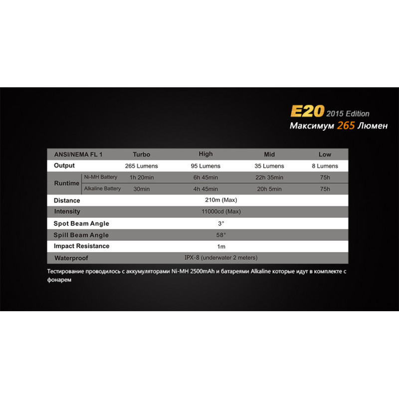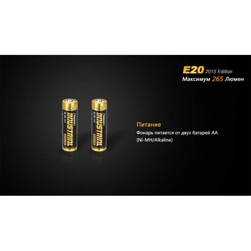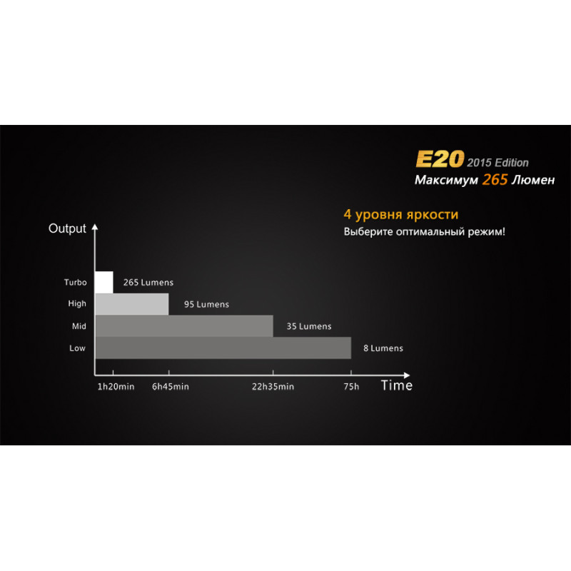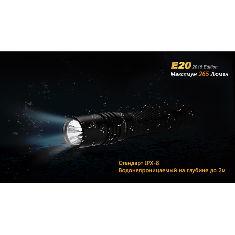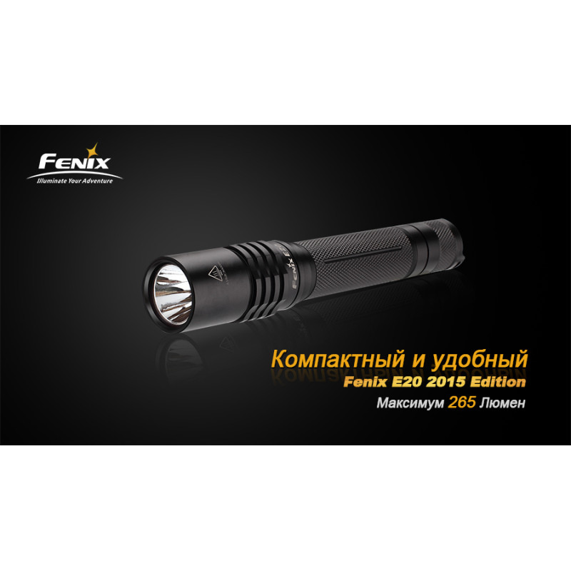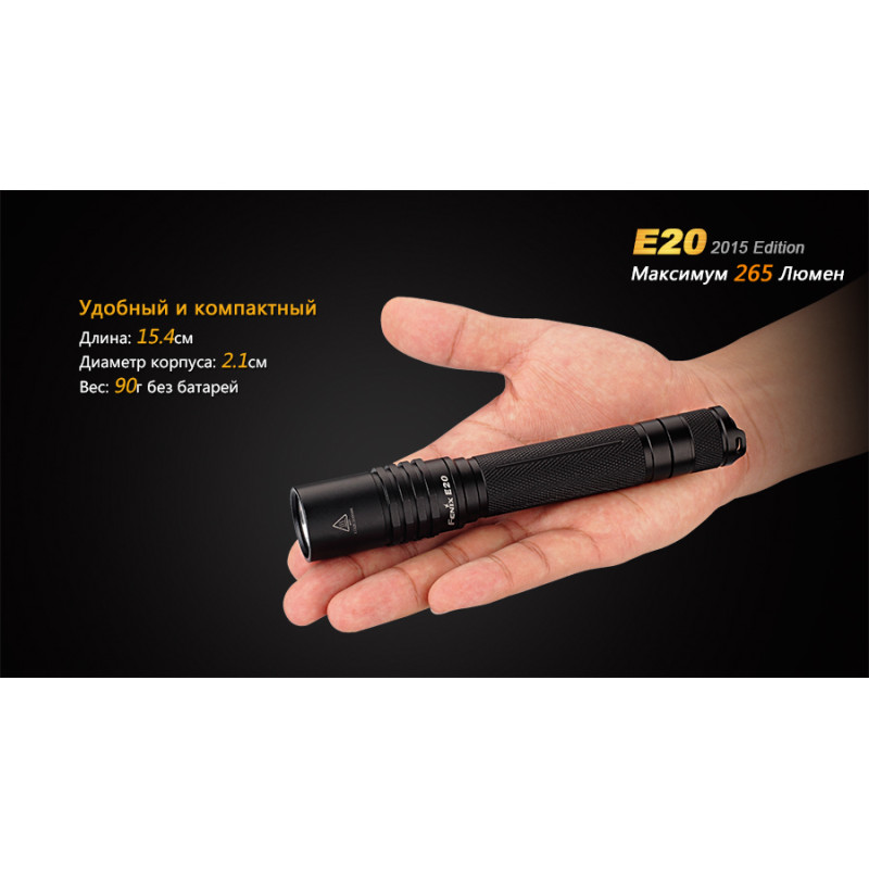 Якщо ви шукаєте невеликий, але яскравий і простий в управлінні ліхтар, то модель Fenix E20 2015 — як раз для вас. Цей ліхтар працює на базі сучасного світлодіода Cree XP-E2, який забезпечує яскравість світла до 265 люмен і в стані опрацювати близько 50 000 ч. Робочих режимів в даній моделі — чотири: