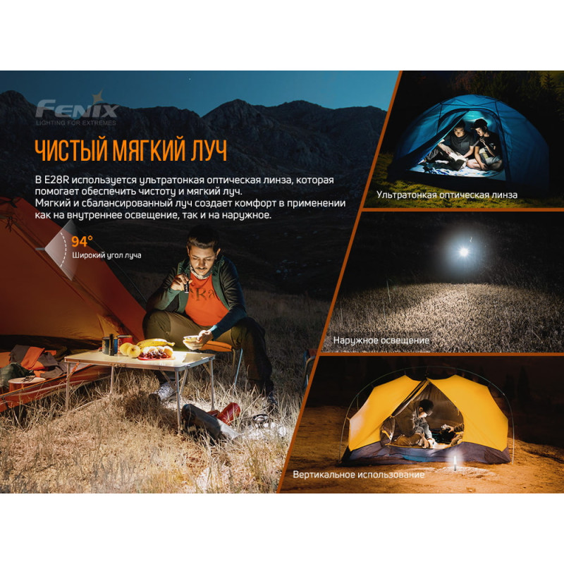У E28R надтонка оптична лінза, завдяки якій виходить м'який і збалансований потік світла. Кут огляду променя досягає 94 градусів. Стане в нагоді користувачеві для подорожей та мандрівок. Ліхтар – чудовий супутник туриста, і він забезпечить ефективне освітлення як в наметі, так і в дорозі. E28R ідеальний для туризму. Нижче – в деталях про специфічні риси цього ліхтаря.