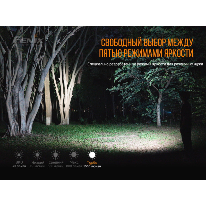 | Яскравість | 1500 люмен | 800 люмен | 350 люмен | 150 люмен | 30 люмен | 1500 люмен |