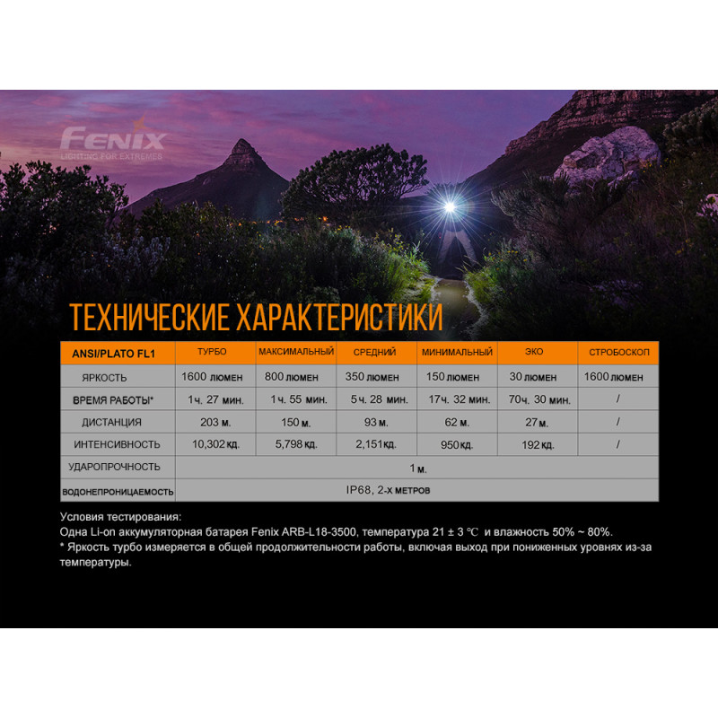 Turbo: промінь світла має дальність 203 м, яскравість 1600 люмен, інтенсивність 10 302 кд. Ліхтар без підзарядки працює 1 год 27 хв;