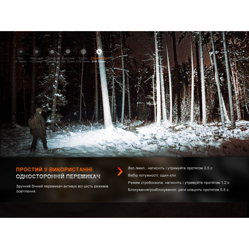 - Turbo: 3100 люмен / 15 103 кандел / 260 метрів / 2 години 30 хвилин;