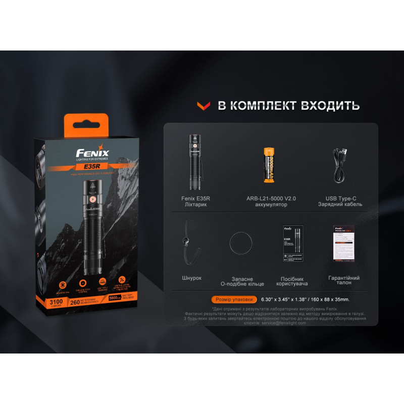 Ліхтар Fenix E35R зі знімною кліпсою, акумулятор Fenix 5000 мАгод, темляк на руку, кабель USB-C для заряджання, гарантійний талон, посібник з експлуатації.