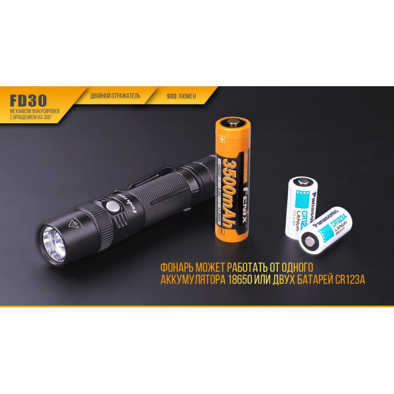 До речі, Fenix FD30 працює на одному акумуляторі 18650. Він легко замінюється двома батарейками CR123A.