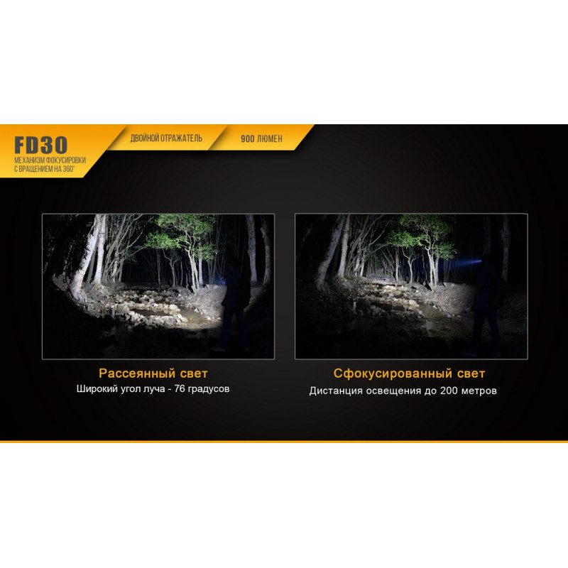 Модель ліхтарі Fenix FD30 розрахована на використання в найбільш широкому переліку ситуацій. Цей ліхтар буде вдалий для поїздок на природу, походів, використання на дачі і в інших випадках. Він оснащений діодом XP-L HI (Cree), який у режимі максимальної яскравості надає 900 люмен світла. Універсальність цієї моделі сприяє і те, що вона підтримує 6 режимів.