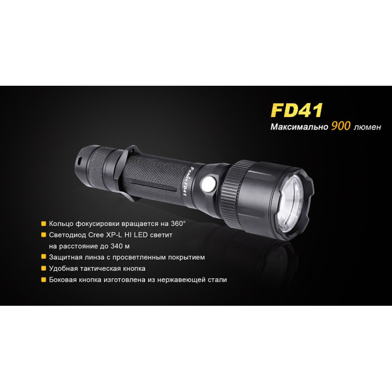 Модель Fenix FD41 увійшла в одну з нових серій ліхтарів бренду Fenix, яка об'єднує екземпляри з рухомою передньою лінзою. Така особливість конструкції дозволяє більш гнучко управляти освітленням, адже крім п'яти режимів роботи, користувач може вибрати і дальність освітлення, а разом з цим — ширину променя. Фокусна відстань вбудованої лінзи ліхтаря легко змінюється при обертанні кільця, яке розташовується в районі голови приладу. Це кільце повертається на 360°. В залежності від його положення, ширина променя ліхтаря може досягати 81°, завдяки чому створюється рівномірний заливне освітлення на близькій та середній дистанції. В тому положенні, коли промінь найбільш сфокусований, він висвітлює об'єкти на дальній дистанції. Максимальна дальність для моделі Fenix FD41 становить 340 метрів.