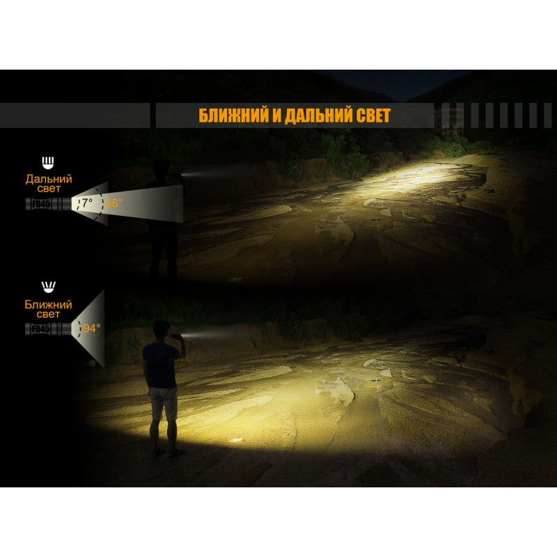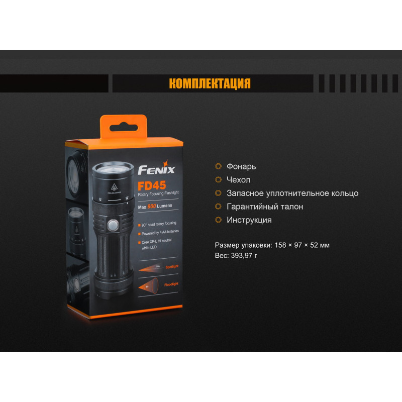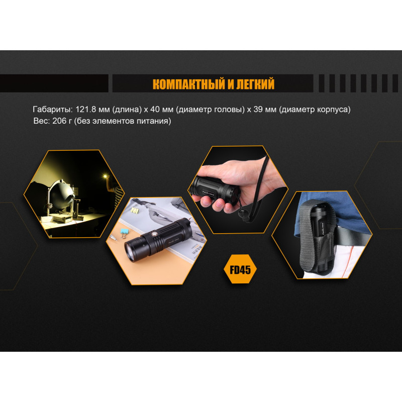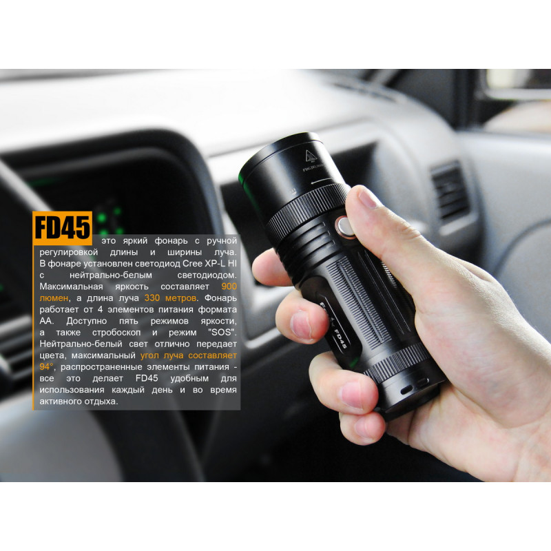 Fenix FD45 – ліхтар, який здатний впоратися з дуже широким колом завдань. Він зовсім невеликий за розміром, щоб носити цей ліхтар було зручно і просто в кишені, досить легкий. Але завдяки використанню сучасних технологій, яскравого діод Cree XP-L HI і особливих TIR лінз, він є надзвичайно практичним.
