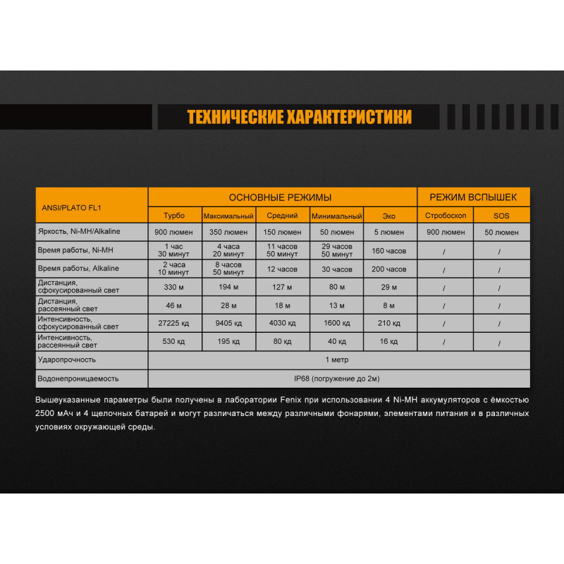 В режимі Turbo ліхтар дає 900 люмен світла, а радіус освітлюваної території становить 46-330 метрів. З батарейками ліхтар може працювати 2 години 10 хвилин, а енергії акумуляторів вистачить на півтора години.