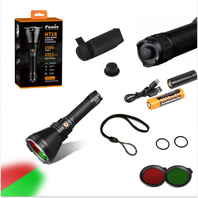 Ліхтар Fenix HT18, акумулятор, кабель для зарядки USB Type-C, перехідник ALF-18, червоний фільтр, зелений фільтр, чохол з регулюванням довжини, ремінець на руку, запасне кільце, запасна гумова накладка на кнопку, керівництво по експлуатації, гарантійний талон.Керівництво до застосування: