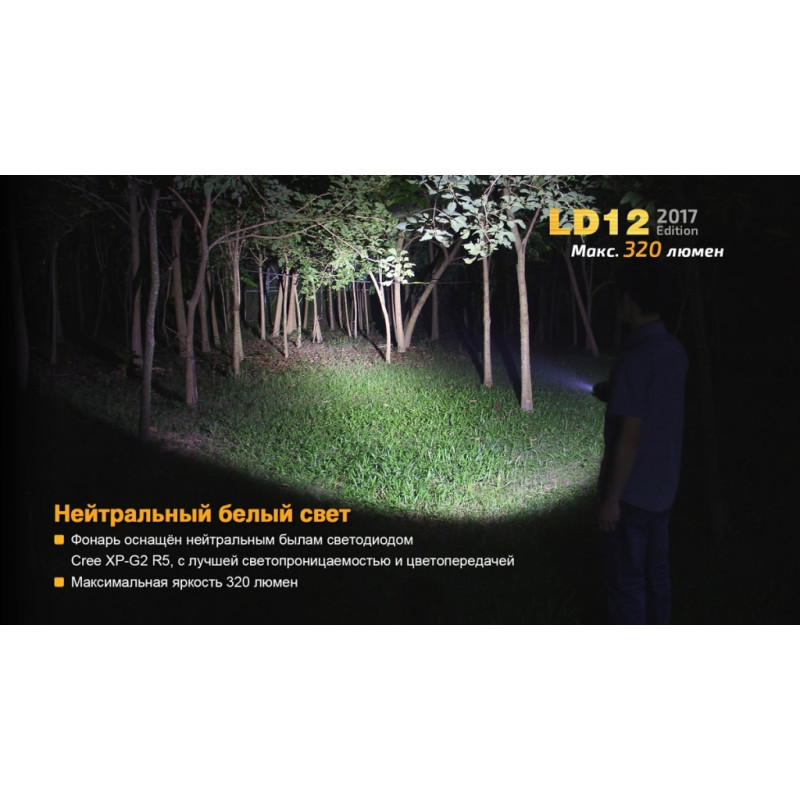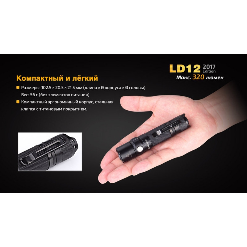 Модель Fenix LD12 вже досить тривалий час користується популярністю серед покупців. Тому фахівці компанії Fenix вирішили додатково її удосконалити і знову випустити в 2017 році. В оновленому варіанті — це ще більш зручний ліхтар для універсального використання. LD12 2017 оснащений світлодіодом XP-G2 R5, випущеним компанією Cree, який дає світло нейтрального білого спектру і світить 50 000 годин. Найяскравіший режим Turbo, дає 320 люмен світла. За ним слідують режими High на 70 люмен, Mid на 30 люмен і найекономніший по відношенню до витрати енергії — режим Low на 5 люмен. При цьому необхідно відзначити особливість даної моделі — максимальну яскравість ліхтар підтримує тільки з акумуляторів 14500. Передбачено використання та інших елементів живлення (пальчиковий акумулятор Ni-MH і лужні батарейки АА), однак вони зможуть забезпечити тільки 150 люмен яскравості. Яскравість в режимі Strobe також залежить від батарейок і відповідає максимально можливій для цього елемента живлення. Час роботи ліхтарика також залежить від його живлення. Для формату 14500 — це максимум 50 годин без заміни, для Ni-MH — 60 годин. Батарейки зможуть служити трохи менше — до 40 годин.