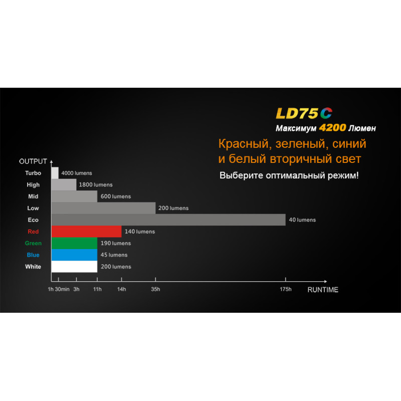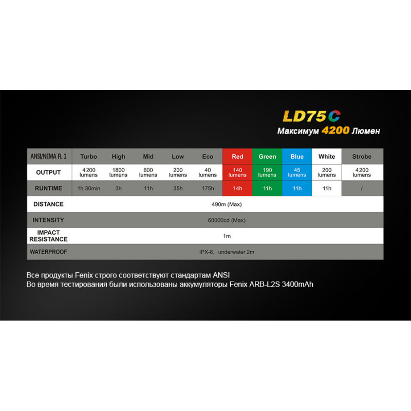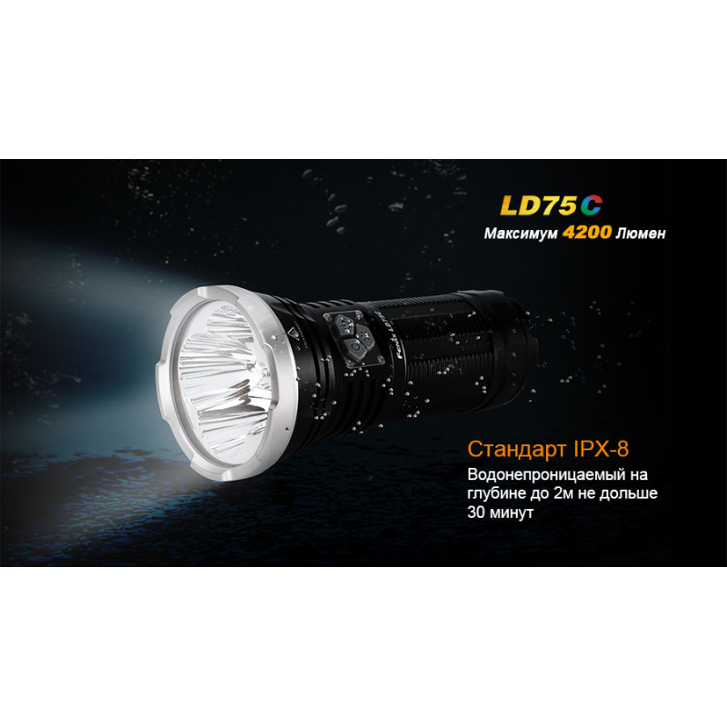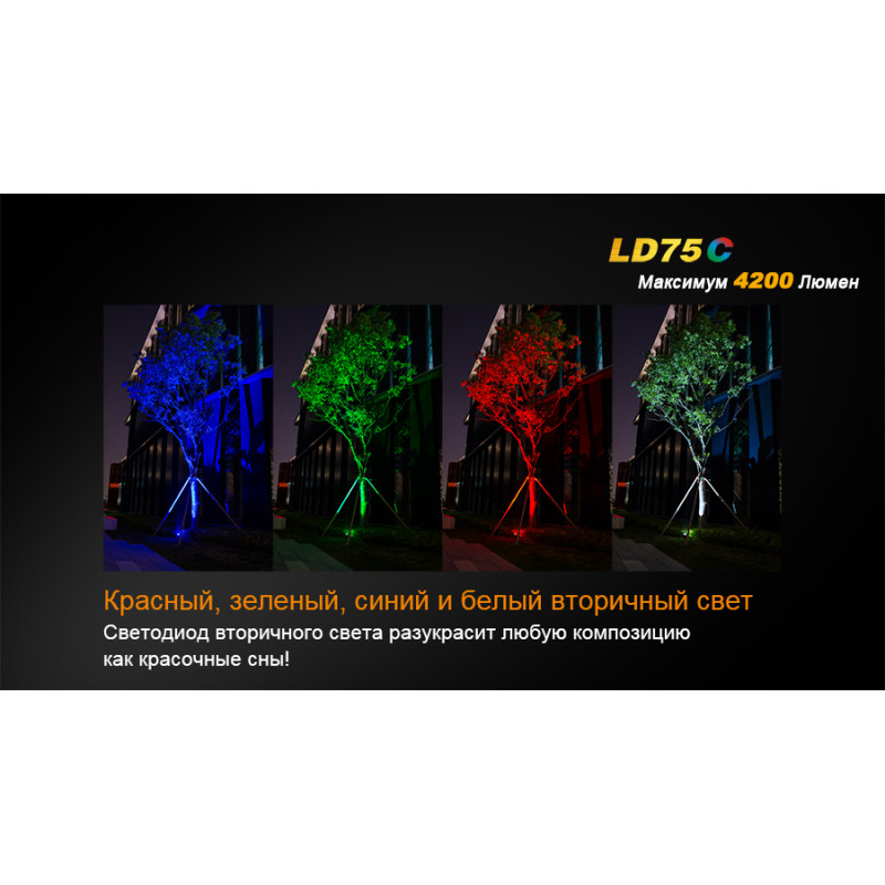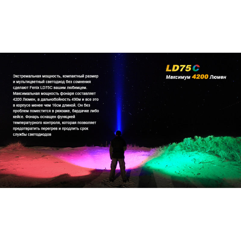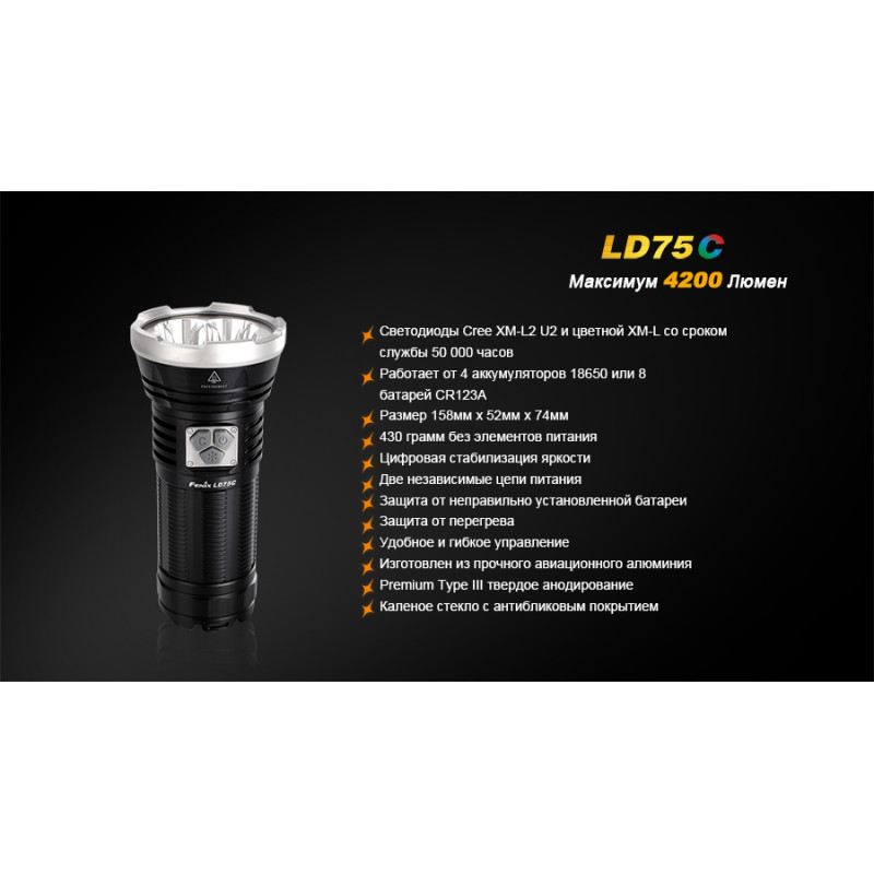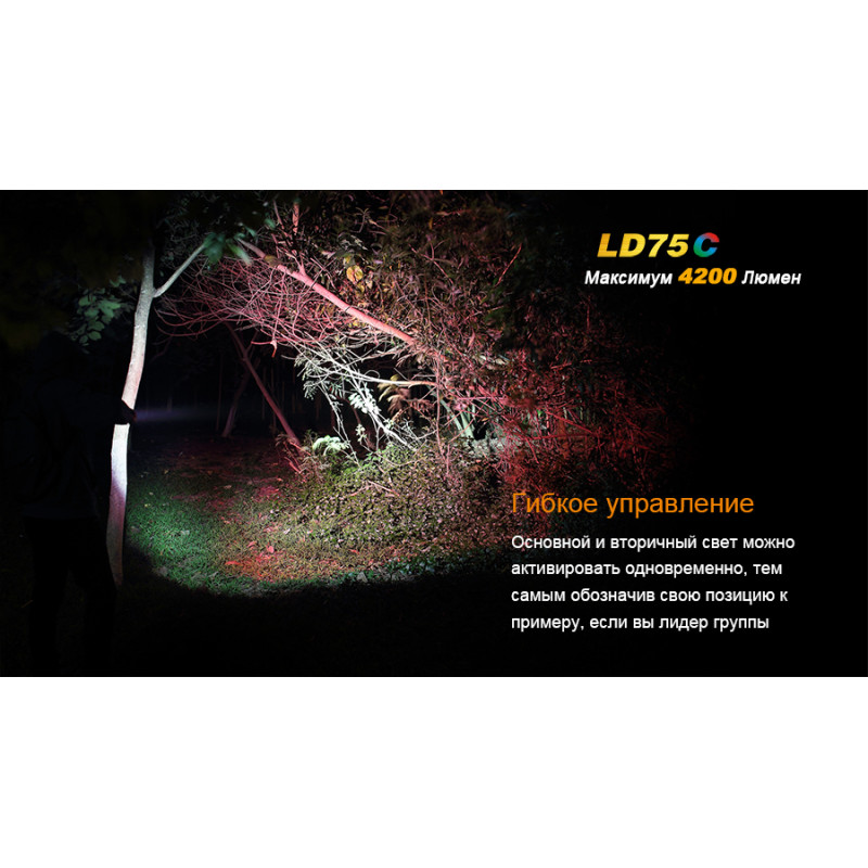 Ліхтар Fenix LD75C виробники забезпечили чотирма потужними світлодіодами Cree XM-L 2 U2, кожен з яких має в своєму розпорядженні запас працездатності в 50 000 ч. Яскравість цих діодів в максимальному режимі становить 4200 люмен. В додаток до них можна включити п'ятий мультицветный діод, який в режимі білого світла додасть ще 200 люмен яскравості. Крім того, цей діод може працювати в режимі червоного світла з яскравістю 140 люмен, забезпечуючи умови для збереження нічного зору. В режимі зеленого світла можлива яскравість 190 люмен, а в режимі синього — 45 люмен. Регулювання яскравості звичайного білого світла, а також переключення інших режимів роботи здійснюється за допомогою трьох кнопок управління, які компактно розміщені в головній частині корпусу ліхтаря.