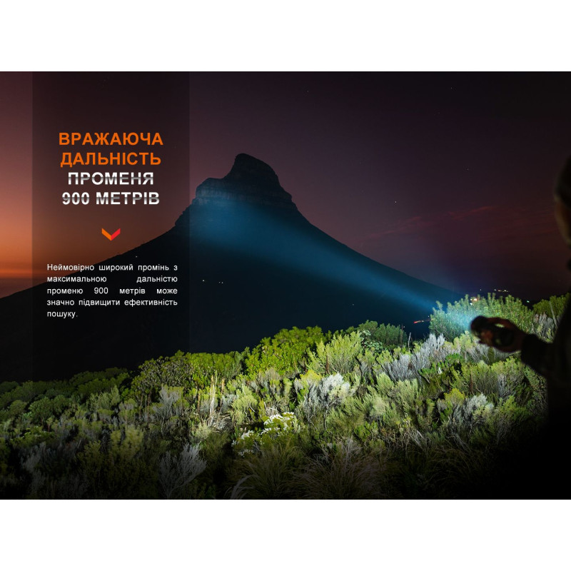 Пошукова модель LR40R V2.0 від Fenix виділяється не тільки яскравістю світла та великим набором режимів, а й відчутно компактнішими габаритами у порівнянні з освітлювальними пристроями аналогічного типу від інших виробників. Ліхтар можна утримувати однією рукою, і при цьому його функціонал вражає наявністю цілих сімнадцяти світлодіодів (1 x Luminus SFT70, 16 x Lumileds HL2X), які генерують над’яскравий світловий потік до 15 000 люмен.