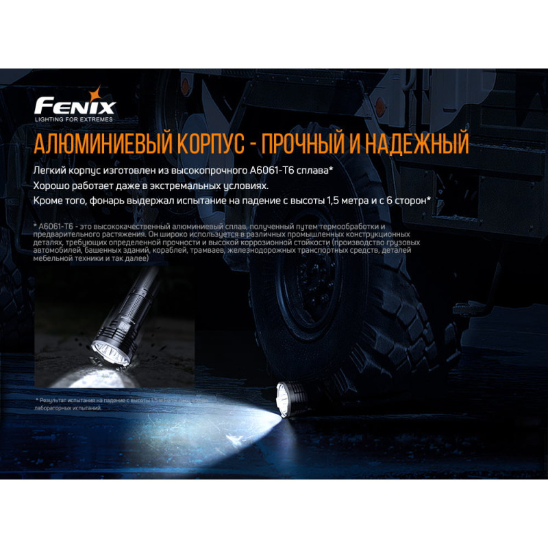 | Комплектація | ліхтар, акумулятор Fenix ARB-L52-16000, кабель для зарядки USB Type-C, ремінець на руку, чохол, стропа на плече, запасне кільце для ущільнення стіків корпусу, інструкція до застосування, талон гарантії. | ||||||||||