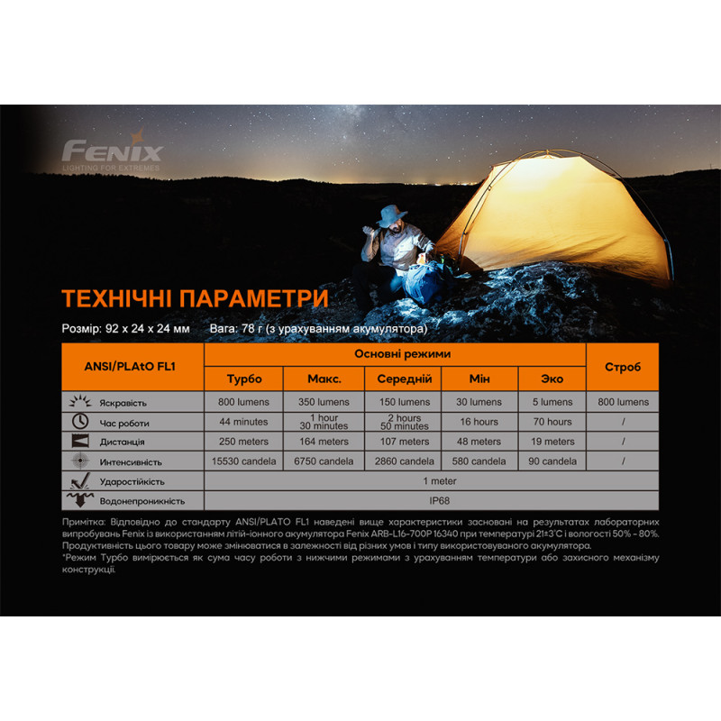 Ці дані по роботі ліхтаря були отримані в результаті лабораторних випробувань, де застосовували літій-іонний акумулятор 16340 Fenix ARB-L16-700P при температурі 21 +- 3 градуси Цельсія. Вологість повітря склала 50% -80%. Реальні параметри світіння моделі можуть відрізнятися від наведених – в залежності від умов зовнішнього середовища і застосовуваного акумулятора.