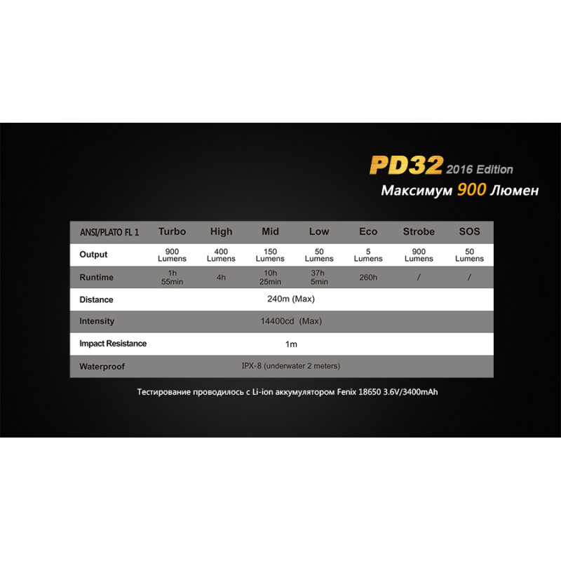 Найяскравіший режим Fenix PD32 — це Turbo на 900 люмен. З цієї яскравістю ліхтар у стані пропрацювати від одного заряду акумулятора майже дві години. Чотири години він буде світити в другому режимі — High — з яскравістю 400 люмен. Режим Mid передбачає яскравість 150 люмен при тривалості роботи до 10 годин 25 хвилин. А ось в режимі Low з яскравістю 50 люмен, ліхтар в стані опрацювати вже 37 годин 5 хвилин. Найменш яскраве освітлення дає режим Eco (5 люмен). Зате тривалість роботи в ньому становить 260 годин. Для миготливих режимів виробники вказали тільки один параметр — яскравість. То 900 люмен в режимі Strobe і 50 люмен в режимі SOS.