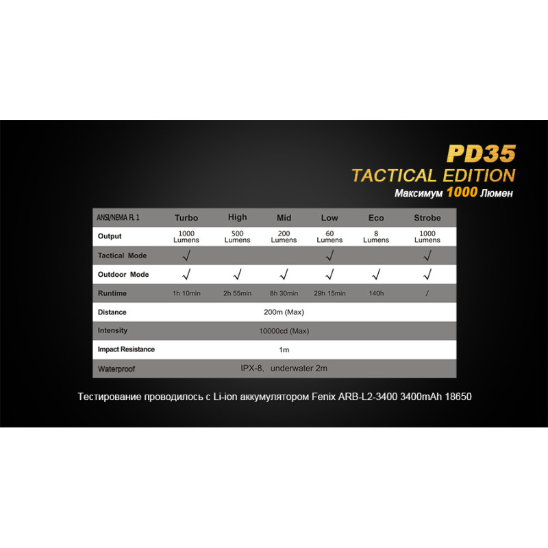 Виробники протестували роботу моделі Fenix PD35 TAC на базі фірмового акумулятора Fenix (модель ARB-L2-3400). На основі цих випробувань отримано такі результати роботи ліхтаря:
