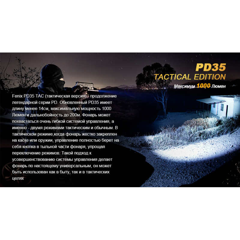Модель Fenix PD35 TAC (Tactical Edition) розроблена на основі популярного ліхтарі Fenix PD35. Однак вона отримала велику яскравість в порівнянні з моделлю 2014 року, більш сучасний світлодіод, ретельно продуману схему керування роботою приладу.