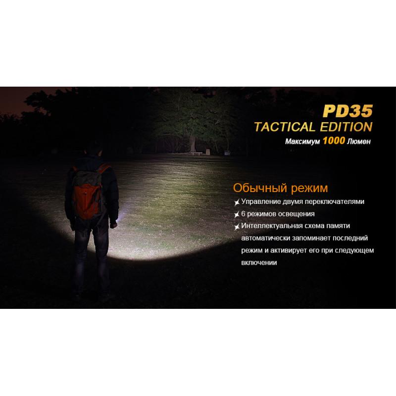 Важливо відзначити, що модель Fenix PD35 TAC захищена від замикання внаслідок недотримання полярності при установці елементів живлення. У ліхтар вбудована система стабілізації яскравості, яка виключає миготіння світла і підтримує постійний рівень освітлення навіть у міру розрядки акумулятора. Передбачена функція індикації низького рівня заряду батарей, яка своєчасно повідомить про необхідність заміни акумулятора. У звичайному режимі роботи ліхтар запам'ятовує кожен вибраний режим яскравості, щоб у випадку, якщо він був останнім перед вимкненням приладу, в наступний раз почати роботу саме з нього.