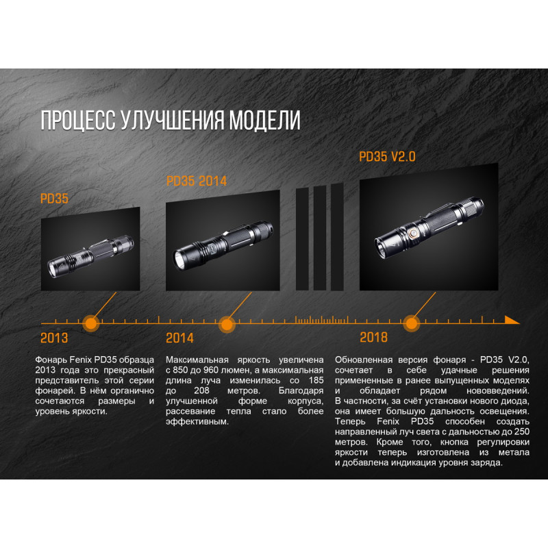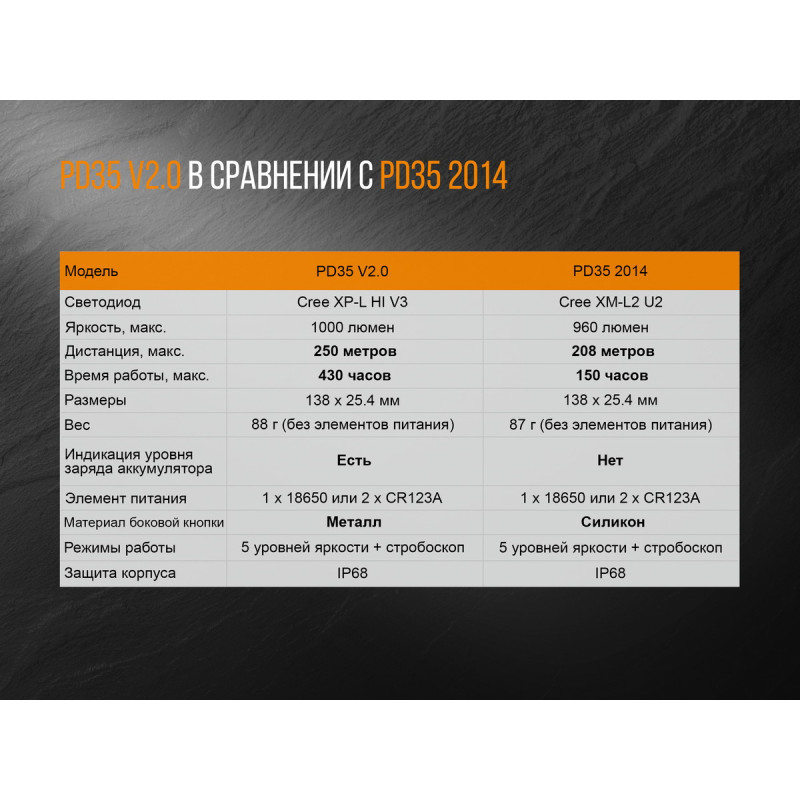 - у моделі Fenix PD35 V2.0 встановлений світлодіод Cree XP-L HI V3;