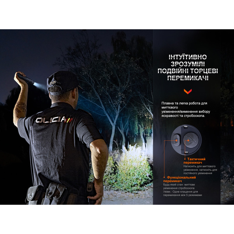 - Напівнатискання тактичної кнопки миттєво активує пристрій в останньому використаному режимі. Для вимкнення достатньо прибрати палець із кнопки.