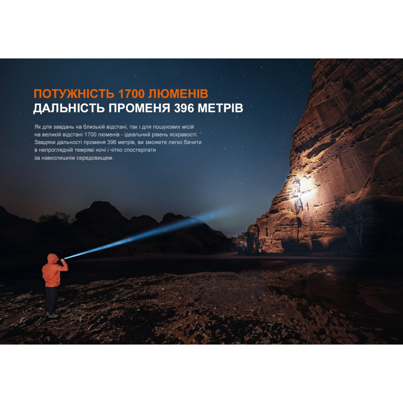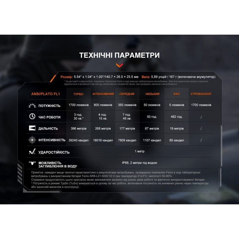 - Turbo: 1700 лм – 39240 кд – 396 метрів – 3 год 30 хв;