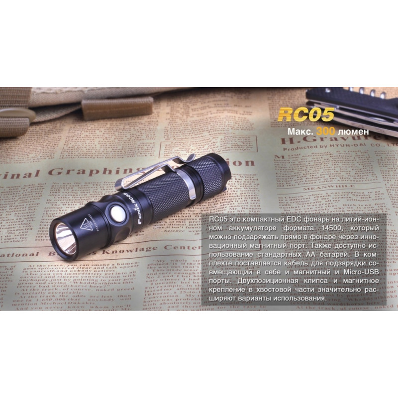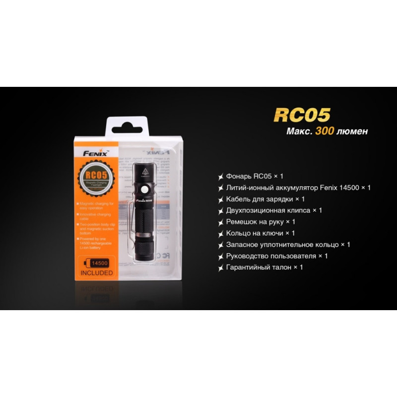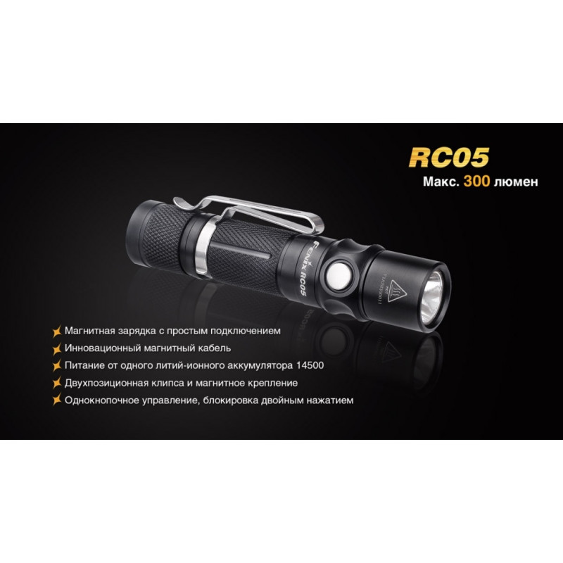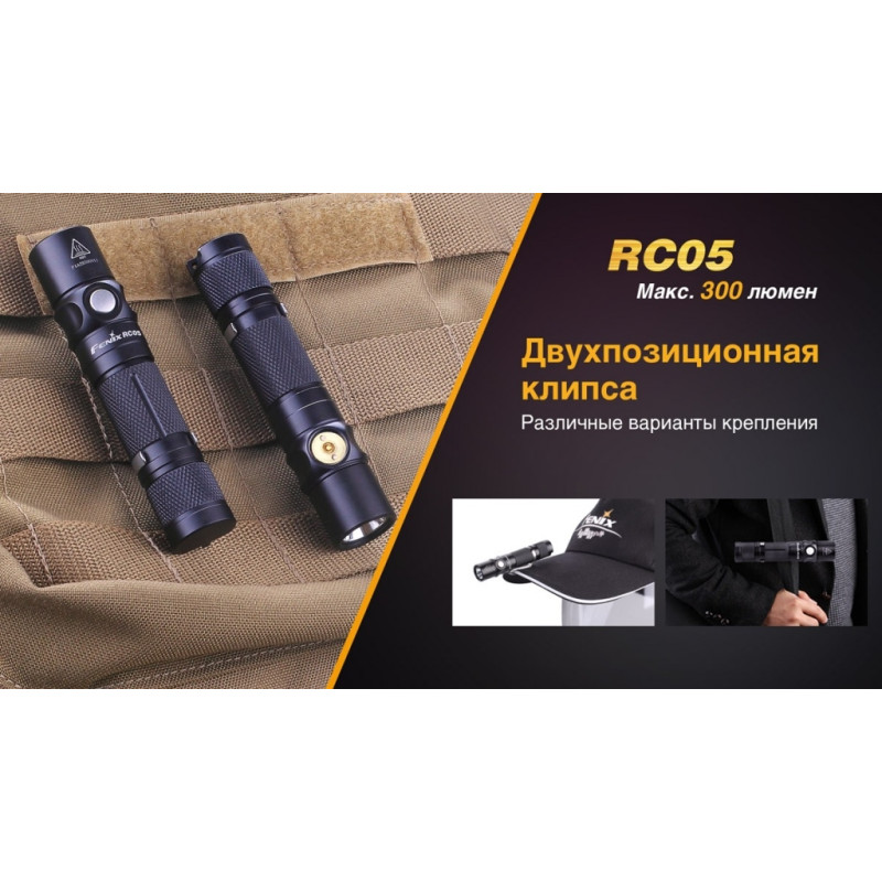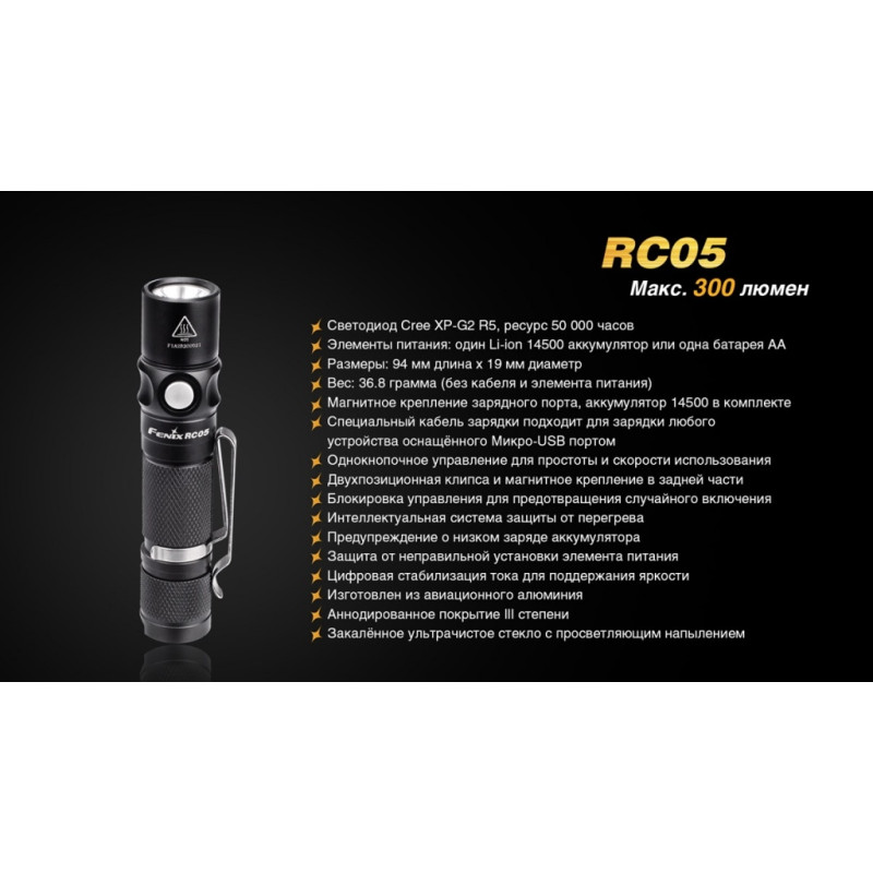 Ліхтар RC05 однаково добре підійде для подорожей, туристичних походів або щоденного використання. Це зовсім компактна, але досить яскрава модель з високим ступенем захищеності від води. Основою для даної моделі інженери компанії Fenix вибрали сучасний діод XP-G2 R5. Його випуском займається американська компанія Cree — відомий виробник напівпровідникової продукції. Ці діоди відомі великою довговічністю і зберігають свою працездатність понад 50 тисяч годин.