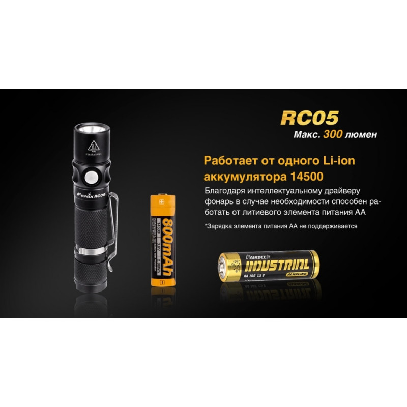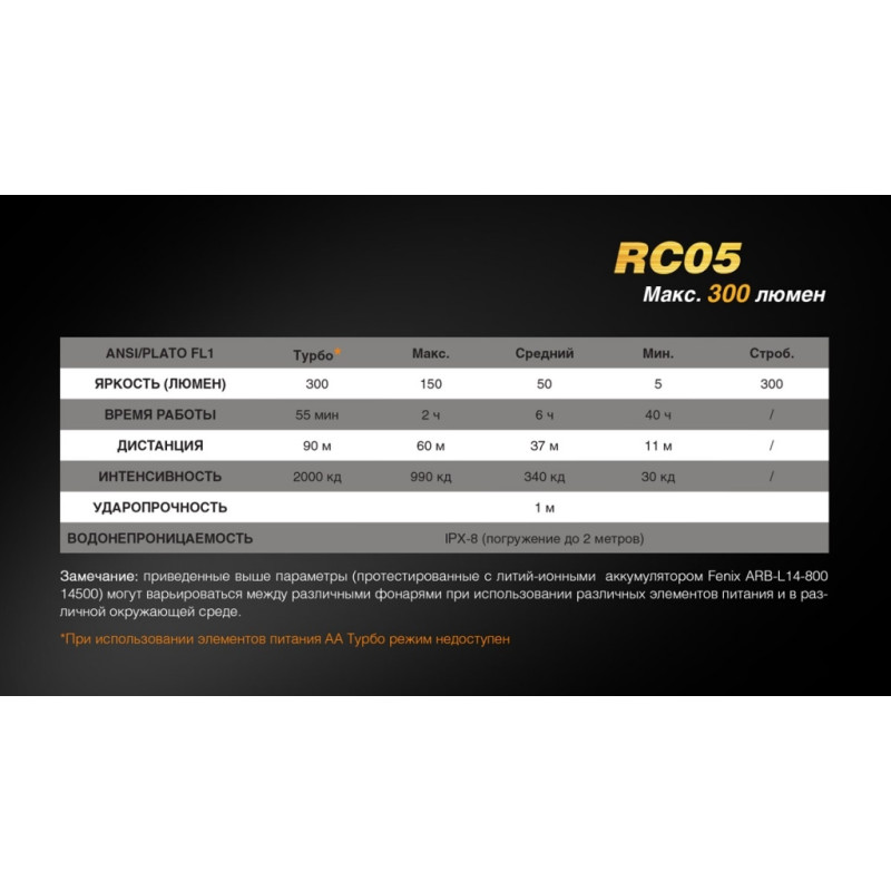 Слід відзначити, що розрахунковий час роботи ліхтарика наведено з урахуванням установки фірмового акумулятора 14500 Fenix ARB-L14-800. Якщо вибрати елемент живлення з іншого ємністю, цей показник може змінитися. Крім того, ліхтар підтримує режим Turbo тільки з акумулятором. Якщо ж використовувати лужну батарейку, він буде не активним. Час роботи ліхтаря в цьому режимі зазначено сумарно, але через 5 хвилин після включення, RC05 автоматично знизить яскравість, щоб оптична система не перегрівалася.