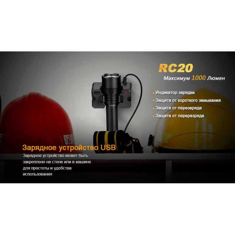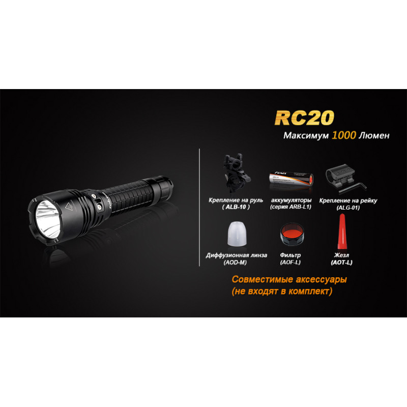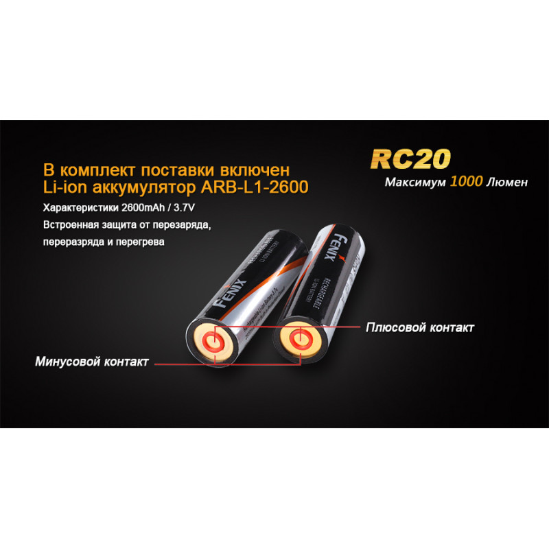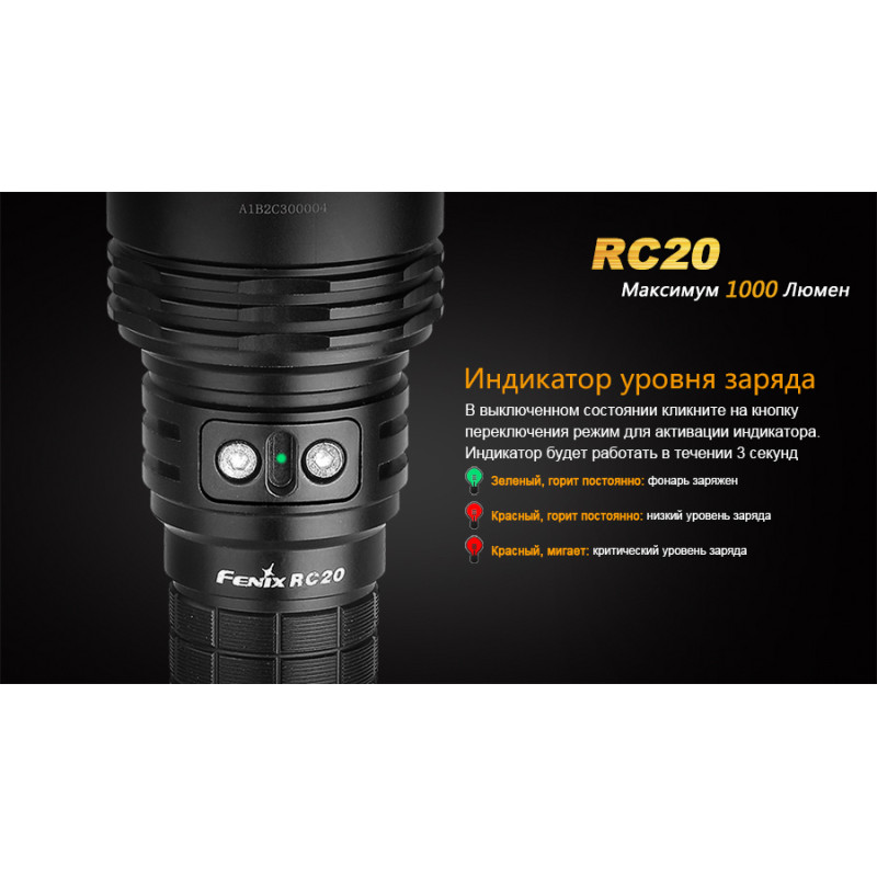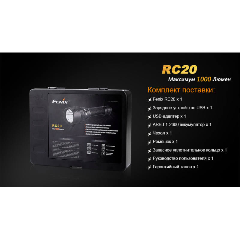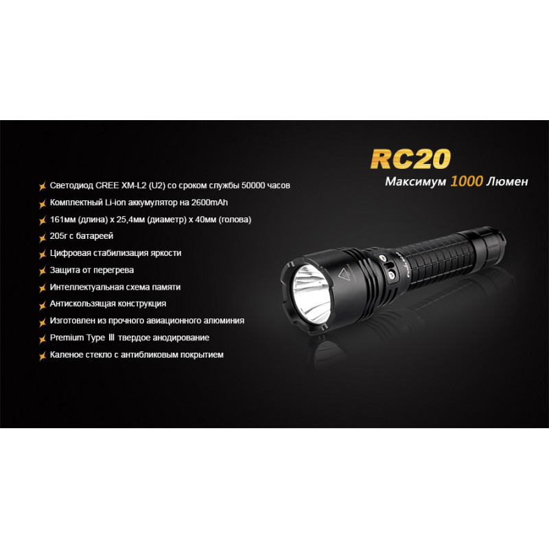 Ліхтар Fenix RC20 відноситься до категорії універсальних ручних ліхтарів, які відмінно підійдуть і для туристичних цілей та для професіоналів, які за родом діяльності потребують якісних і яскравих ручних ліхтарях. Межа яскравості для даної моделі складає 1000 люмен. Ліхтар може працювати у п'яти режимах і висвітлювати простір на 290 м вперед. Запорукою його яскравості послужив світлодіод Cree XM-L2(U2), який також відомий довговічністю і може працювати протягом 50 000 ч.