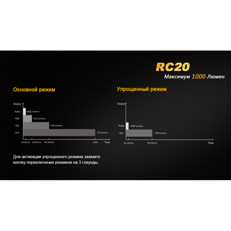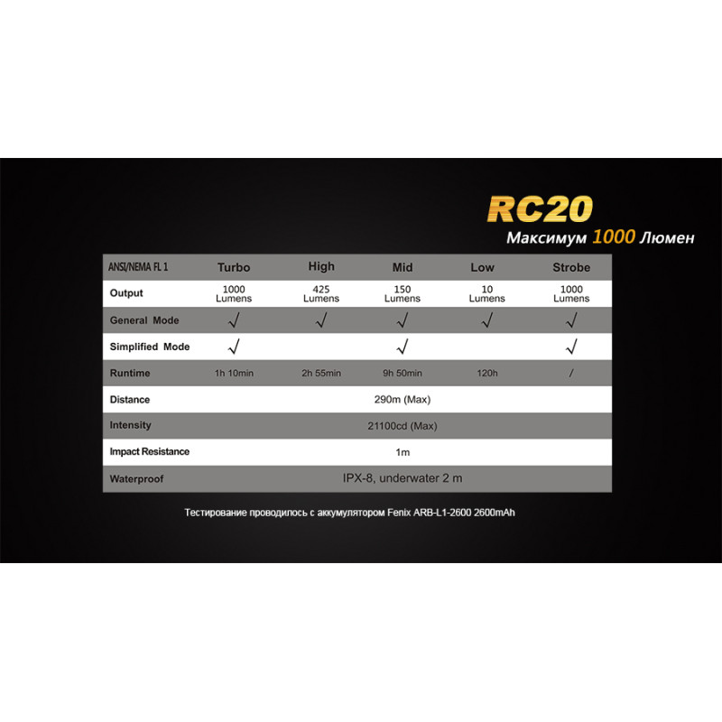 До послуг власника ліхтарі Fenix RC20 4 ступені яскравості: Turbo (1000 люмен), High (425 люмен), Mid (150 люмен), Low (10 люмен). При цьому термін роботи без підзарядки на базі акумулятора Fenix ARB-L1, що накопичує 2600 мАч заряду коливається в межах 1 год 10 хв — 120 ч. Виробники також відзначають можливість купівлі більш ємних акумуляторів Fenix, сумісних з цим ліхтарем.