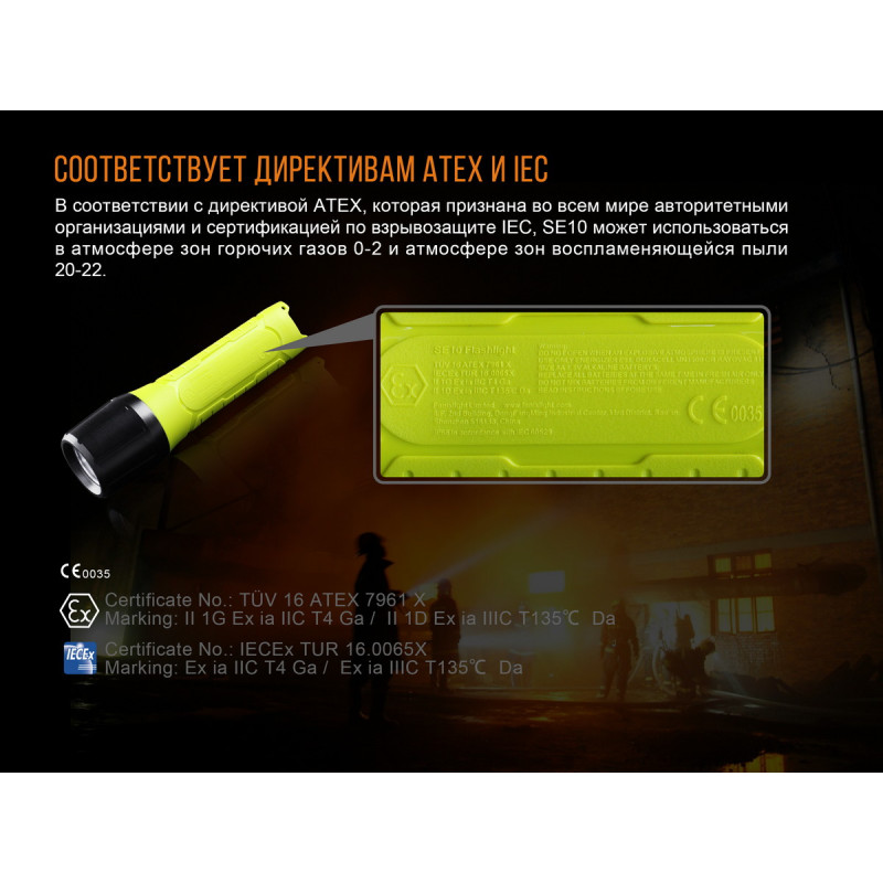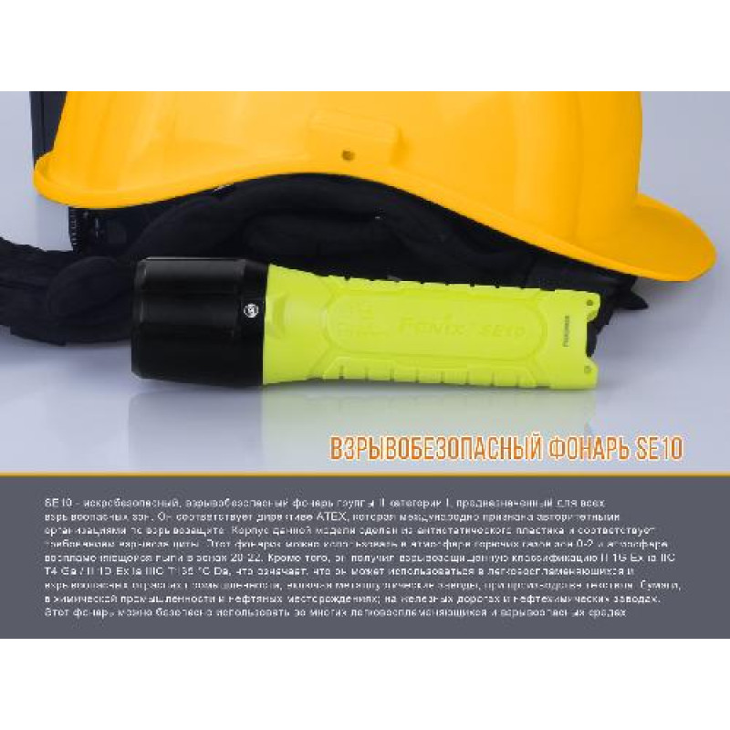 Ліхтар Fenix SE10 є представником наймолодшою лінійки бренду Fenix — вибухозахищених моделей. Такі світлодіодні ліхтарі традиційно використовують на різних підприємствах з видобутку нафти або газу, в хімічних лабораторіях та інших приміщеннях, де включення звичайних приладів для допоміжного освітлення просто небезпечно.