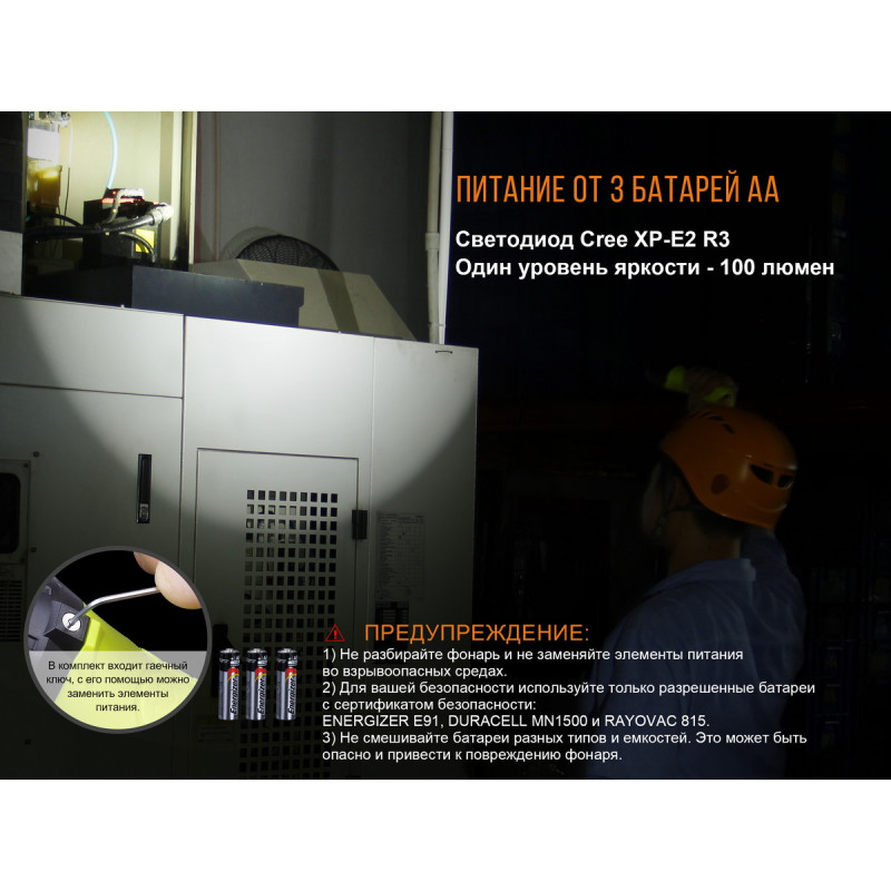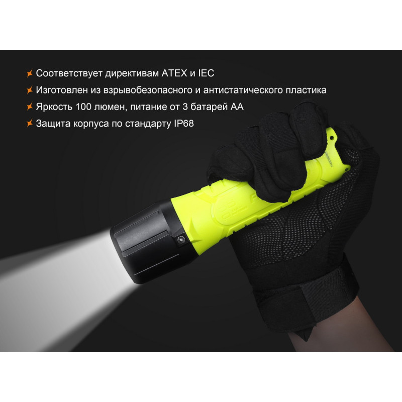 | Комплектація | Вибухозахищений ліхтар, 3 батарейки АА, запасне силіконове кільце, універсальний гайковий ключ, гарантійний талон, декларація відповідності європейським стандартам |