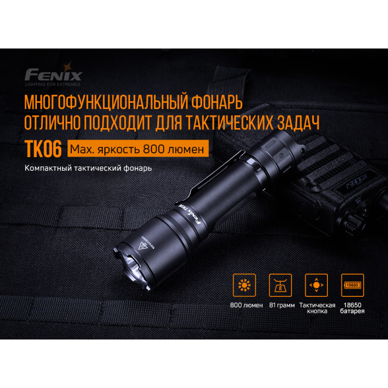 Ліхтар Fenix TK06 являє собою багатофункціональну модель. Годиться для щоденного використання, як з метою роботи, так і відпочинку. Функціонує прилад на діоді Luminus SST20 L4, з живленням від 18650 літій-іонної акумуляторної батареї. Це акумулятор ARB-L18-2600U. діод дає холодне біле освітлення, і може світити протягом 50 тисяч годин. Ліхтар видає максимальний світловий потік в 800 люменів, а максимальна відстань дії променя становить 335 метрів. Можете також використовувати дві літієві батарейки CR123A.