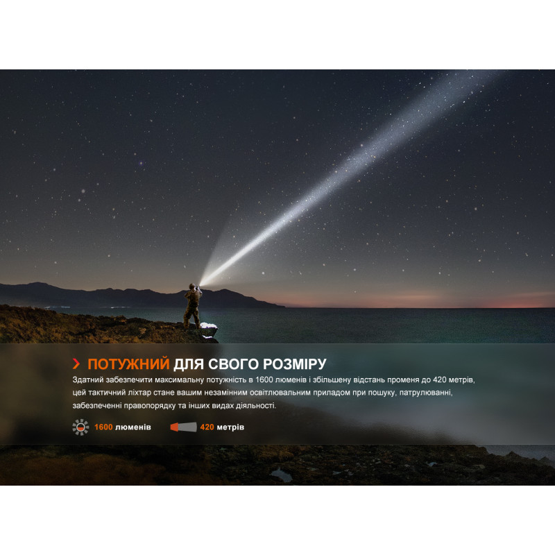 - Високий: 1600 лм – 45000 кд – 420 метрів – 1 год 50 хв;