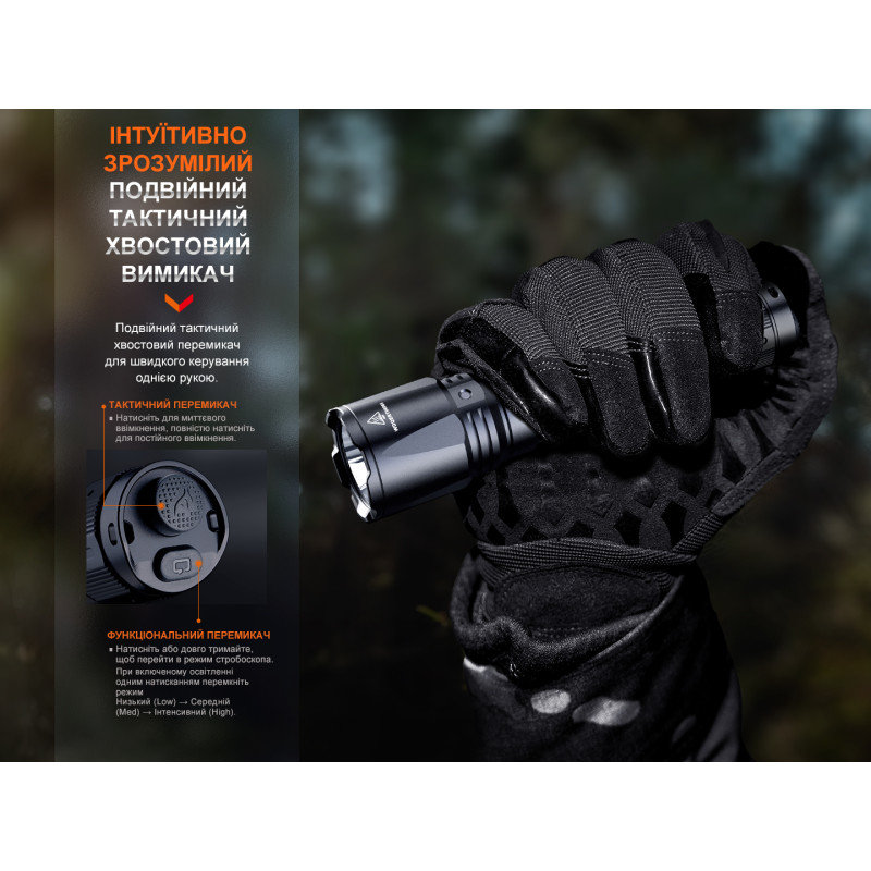 - Тактична кнопка круглої форми з текстурованою поверхнею відповідає за миттєве ввімкнення ліхтаря, яке здійснюється легким напівнатисканням. Натисканням кнопки до упору можна увімкнути режим постійного освітлення.