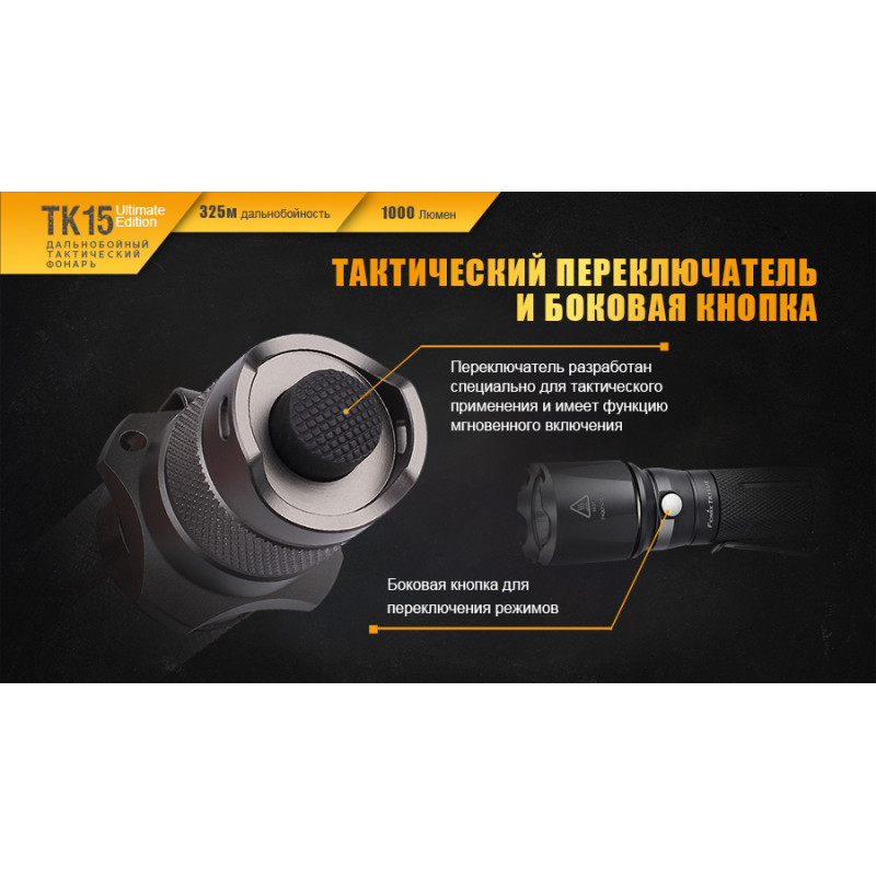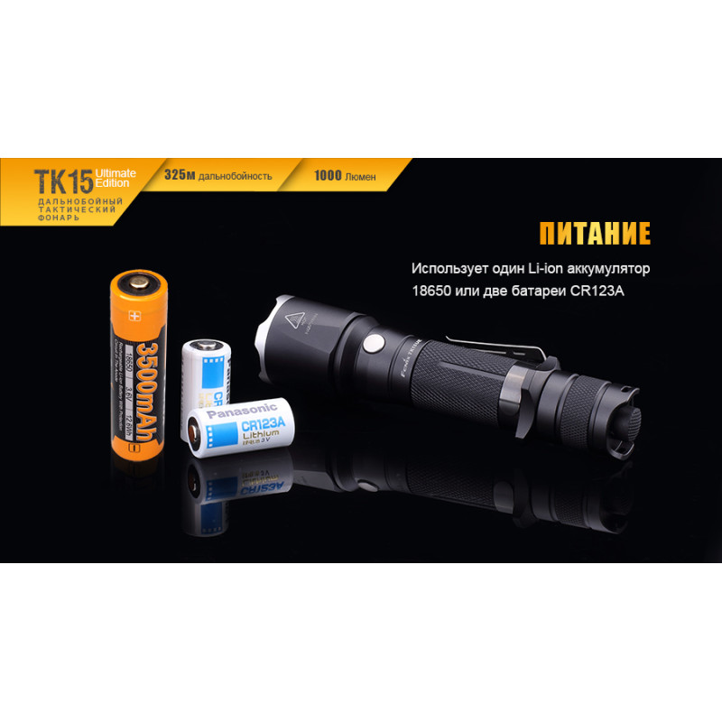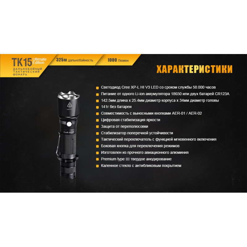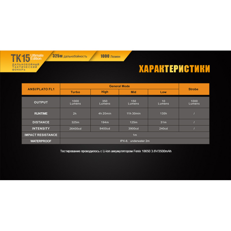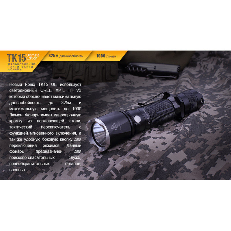 Модель Fenix TK15UE — это удобный и яркий тактический фонарь. Для него производители использовали новый тип светодиодов Cree XP-L HI V3. Он не только мощный, но и очень долговечный (проработает не меньше 50 тысяч часов). Фонарь поддерживает пять режимов, среди которых 4 ступени яркости и стробоскоп для подачи сигналов светом. При условии использования аккумулятора 18650 с запасом энергии на уровне 3400 мАч, рабочие характеристики TK15UE будут следующие: