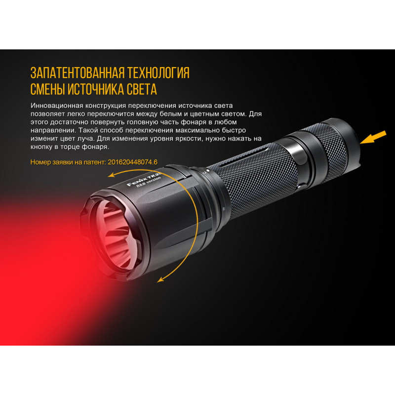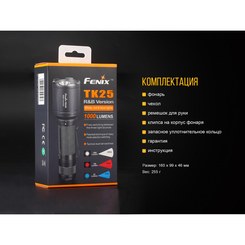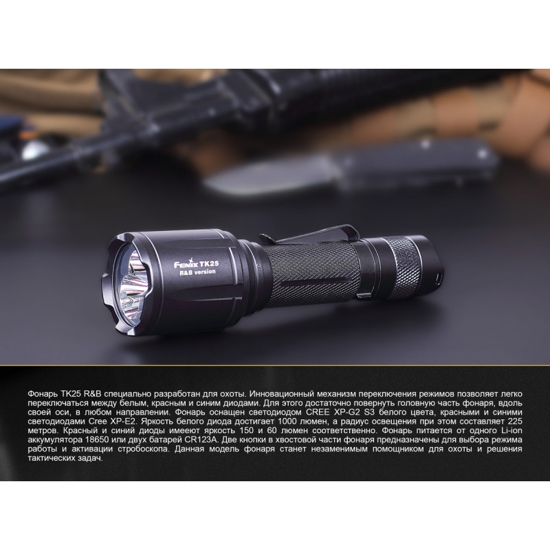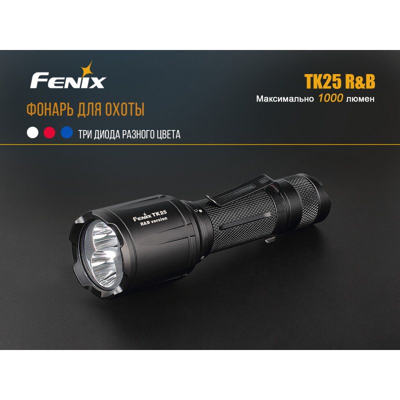 Компанія Fenix не припиняє випускати нові моделі якісних і зручних у застосуванні ліхтарів. Виробники пропонують скористатися тактичним TK25RB, обладнаним відразу двома світлодіодами. Один з діодів працює виключно з білим світлом, підтримуючи чотири рівня яскравості і додатковий режим стробоскопа. Максимально доступна для нього яскравість світла дорівнює 1000 люмен. При цьому, діод прослужить довше, ніж 50 000 годин. Другий діод здатний працювати відразу з червоним і синім світлом, підтримуючи ще три режиму. Його довговічність така ж, як і першого. Виробники привели дані, характерні для кожного з режимів за умови того, що в ліхтар встановлений фірмовий акумулятор ємністю 3500 маг: