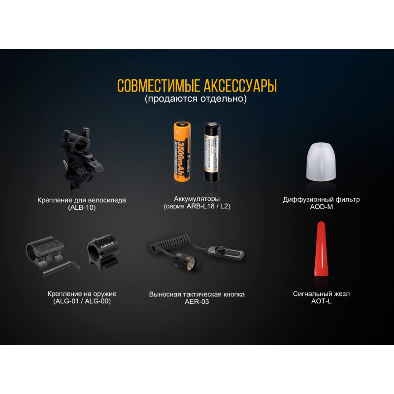 | Комплектація | Ліхтар, чохол, ремінець для руки, кліпса на корпус ліхтаря, запасне кільце ущільнююче |