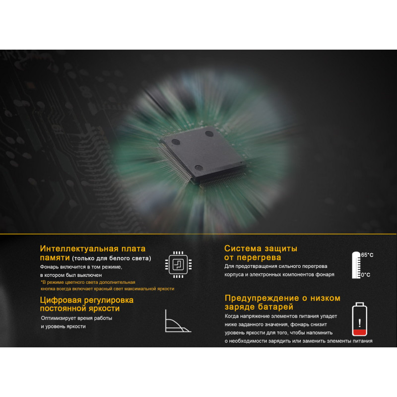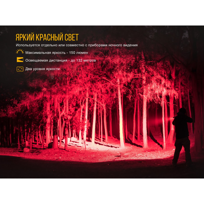 - Red Low: радіус променя — 49 метрів, яскравість — 25 люмен, період роботи ліхтаря — 40 годин;