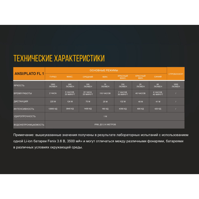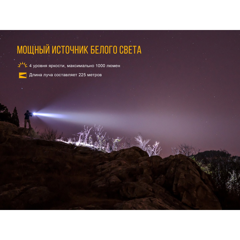 - режим Turbo: радіус променя — 225 метрів, яскравість — 1000 люмен, час роботи ліхтаря — 2 години;
