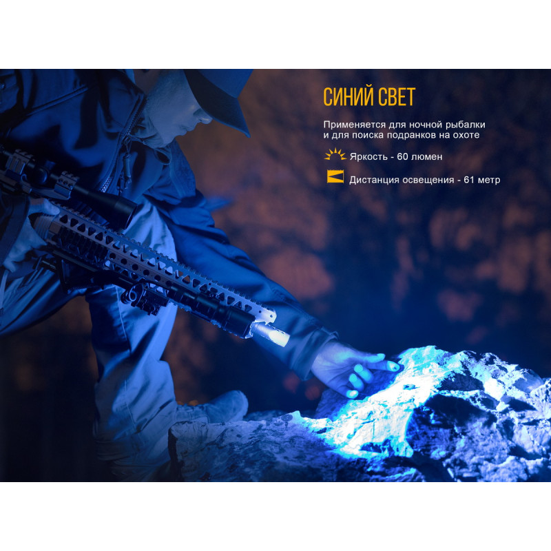 - Blue: радіус променя — 41 метр, яскравість — 60 люмен, період роботи ліхтаря — 6 годин 40 хвилин;