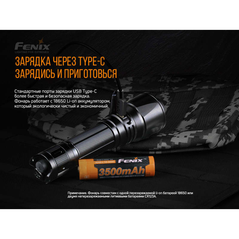 Модель ліхтаря Fenix TK26R, акумулятор Fenix ARB-L18-3400, кабель USB Type-C, кабель для зарядки, ремінець на руку, чохол, запасне кільце ущільнювача, керівництво до застосування, гарантійний талон.