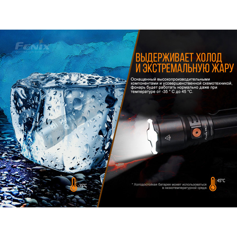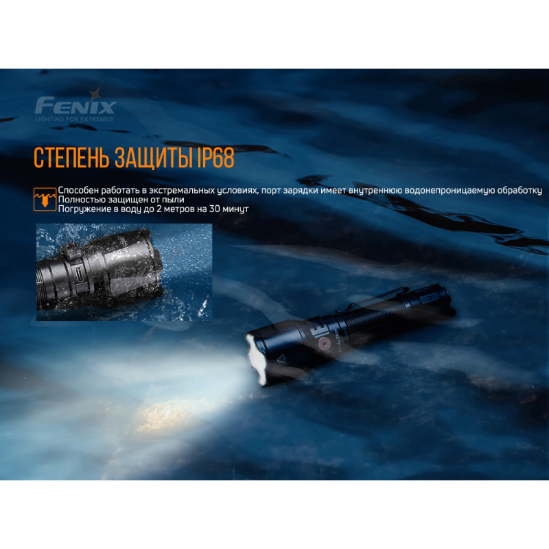 Fenix TK26R володіє надійним захистом від пилу і вологи. Стандарт водозахищеності-IP68. Це означає, що ви можете занурити його на глибину до двох метрів, і там він буде працювати протягом півгодини.