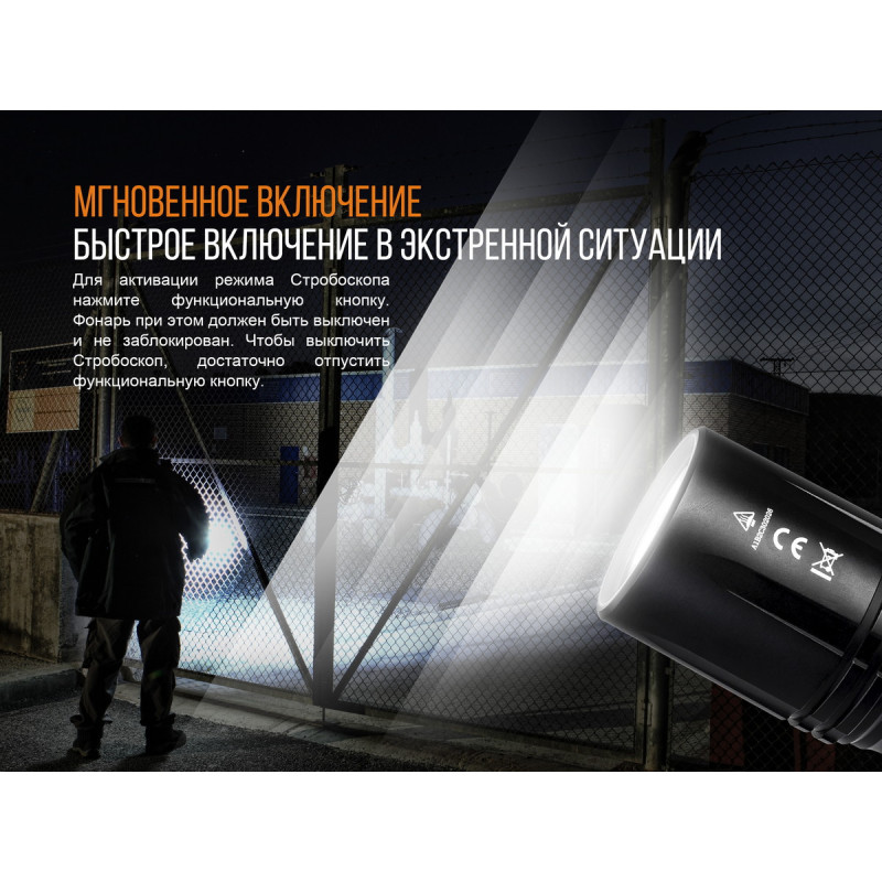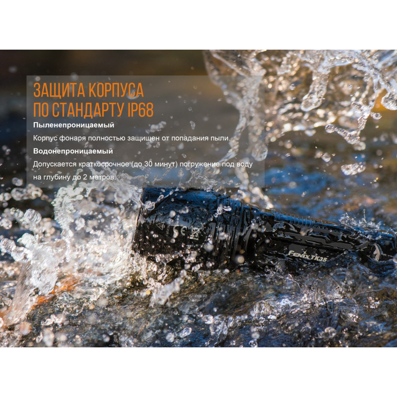 У разі якщо ліхтар буде користуватися в дощ або зовсім під водою, ви можете не хвилюватися за його працездатність. Рівень захисту від пилу і вологи в моделі Fenix TK35 (2018) відповідає міжнародному стандарту IP68, тобто, її можна експлуатувати під водою на глибині до двох метрів (за умови цілісності корпусу, ущільнювальних кілець і наявності мастила).