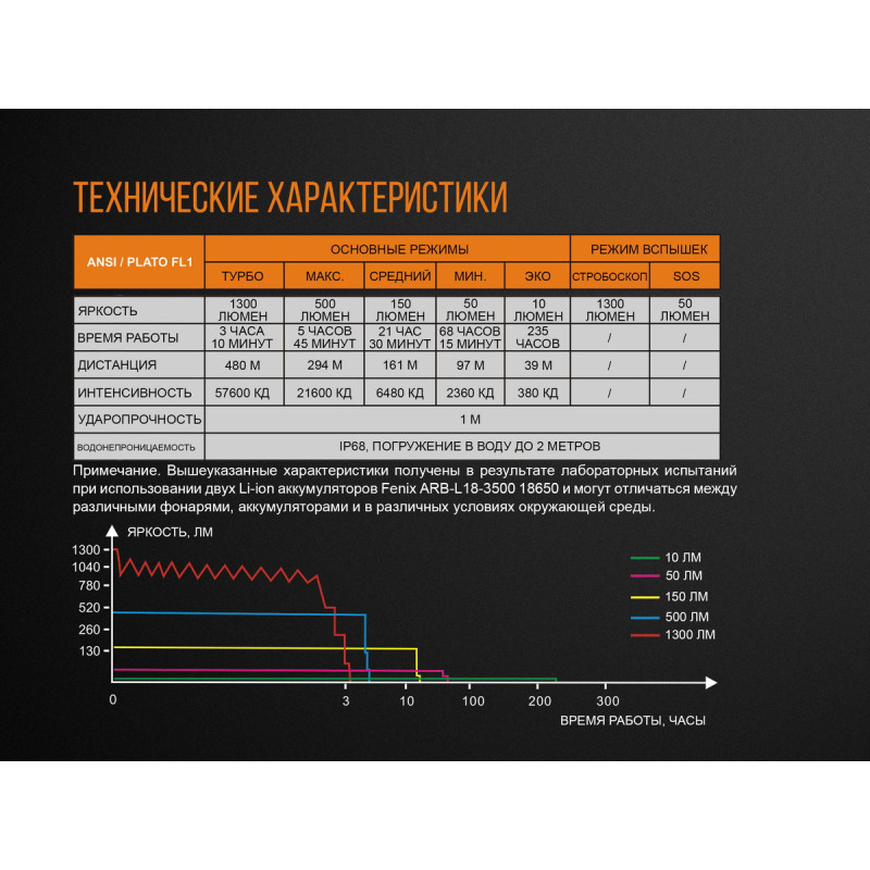 | Яскравість | 1300 люмен | 500 люмен | 150 люмен | 50 люмен | 10 люмен | 1300 люмен | 50 люмен |