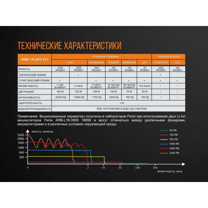 - Turbo: яскравість даного режиму, на відміну від попередньої групи, становить 3200 люмен, ліхтар світить на 300 метрів удалину і працює протягом 1,5 годин.