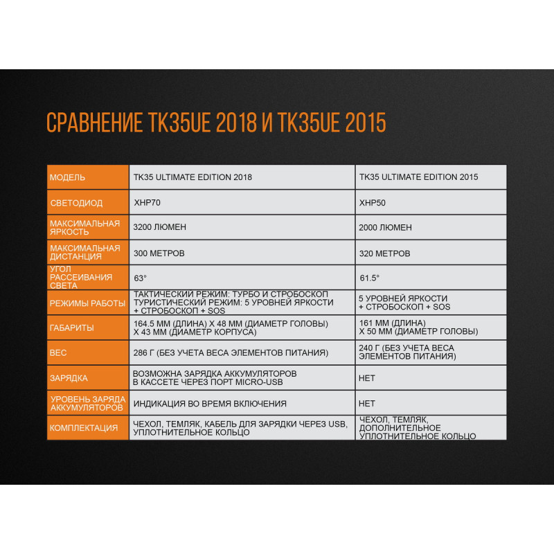 Будь-який турист, спелеолог або ж просто мандрівник тепер може розраховувати на яскраве додаткове освітлення за допомогою невеликого ручного ліхтаря. Модель TK35UE 2018 також орієнтована і на професійне використання, адже вона в змозі задовольнити вимоги рятувальників, дослідників території, а також працівників військових та митних підрозділів.