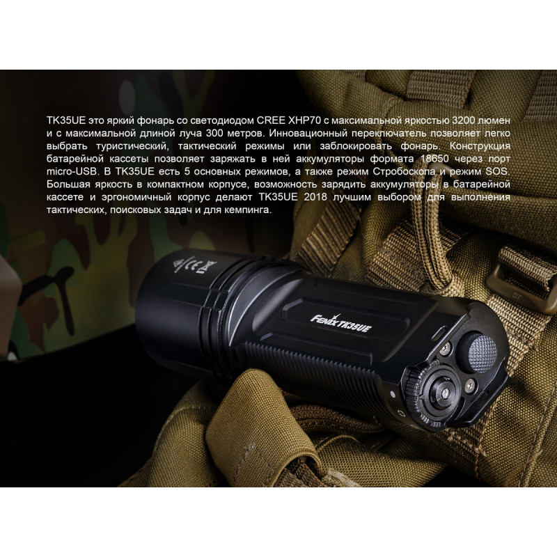 Основою для створення даного ліхтаря став діод XHP70, випущений відомою американською компанією Cree. Він дає світло нейтрально-білого відтінку і забезпечує яскравість до 3200 люмен. До послуг користувачів 5 режимів яскравості (причому один з них насправді має цілих 2 варіанти робочих характеристик) і 2 миготливих режиму. Але в моделі TK35UE 2018 реалізована дуже зручна система доступу до всіх цих варіантів освітлення, тому користувачам дуже легко вибирати серед них оптимальний для тієї чи іншої ситуації. Спеціальний тумблер може бути встановлений в положенні Tactical mode або Outdoor mode, що і визначає, які з режимів можна включити.