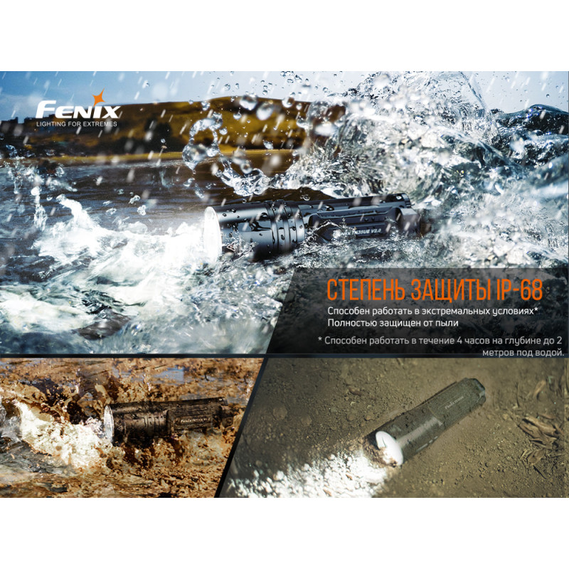 * Зазначені показники роботи ліхтаря вдалося отримати в ході лабораторних випробувань. Де були такі умови: застосовувався один літій-іонний акумулятор Fenix ARB-L 18 - 3000P, температура становила 21 + - 3 градуси Цельсія, а вологість була близько 50% -80%. Фактичні показники роботи ліхтаря можуть відрізнятися в залежності від різних умов навколишнього середовища і використовуваного акумулятора.
