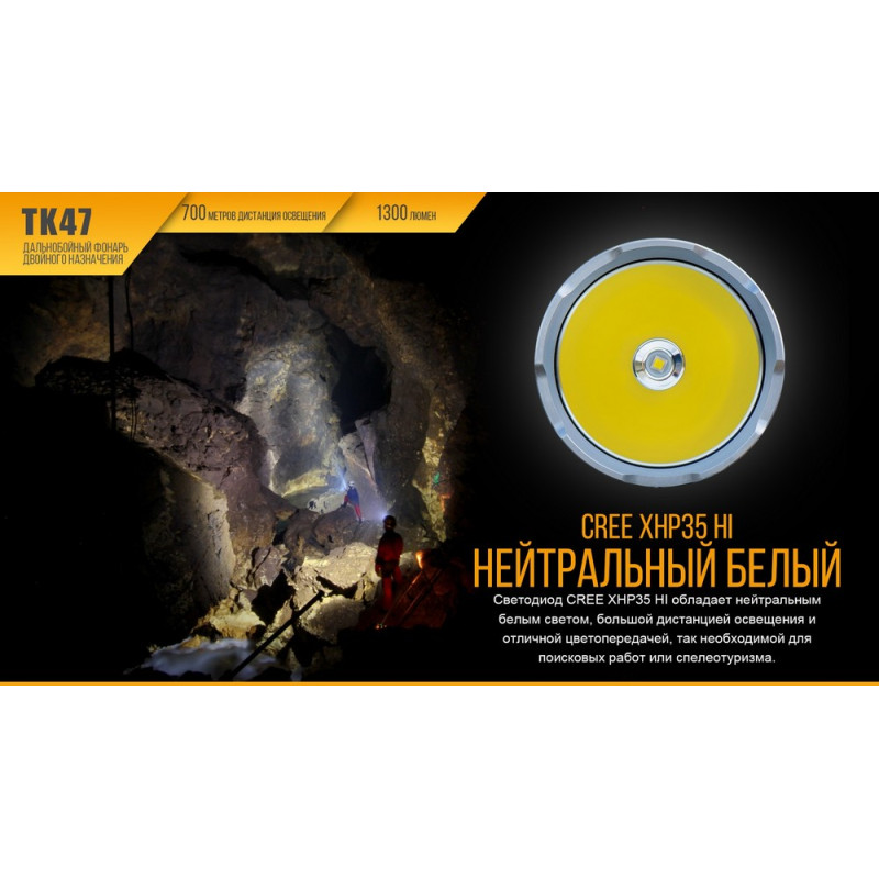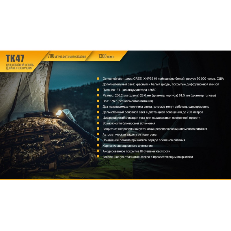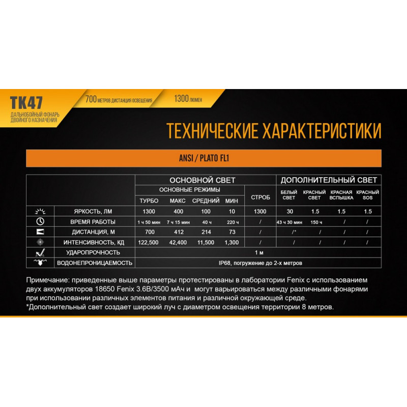 Відразу ж після появи на ринку, модель Fenix ТК47 (2017) привернула до себе найпильнішу увагу: це незвичайний ручний ліхтар з двома незалежними оптичними вузлами. В нього вбудовано три світлодіода, кожен з яких наділений великою довговічністю в роботі. Головний з них розташований в рівному і досить глибокому рефлекторі, здатний запропонувати 1300 люмен яскравості і поширює світло в радіусі 700 метрів (режим Turbo). Крім того, він підтримує ще три рівня яскравості (400, 100 і 10 люмен), а також режим стробоскопа. Якщо встановити в Fenix ТК47 (2017) два фірмових акумулятора розміру 18650 з ємністю кожного — 3500 мАч, то максимальний час автономної роботи цієї моделі складе 220 годин, а з мінімальної яскравістю він зможе продовжувати світити протягом 1 години 50 хвилин. При цьому, необхідно враховувати, що в ліхтар інтегрована захист від перегрівання. При тривалому використанні турборежиму, якщо ТК47 нагріється до 65°С, його яскравість тимчасово автоматично знизиться, щоб ліхтар міг охолонути.